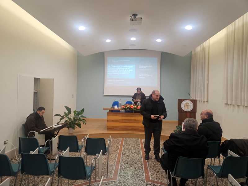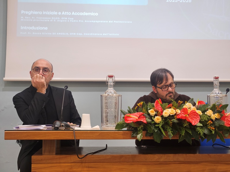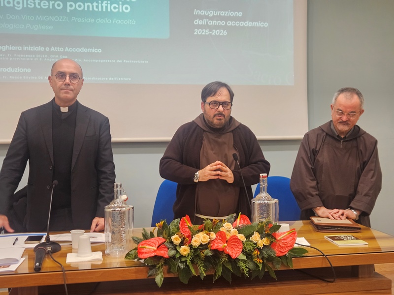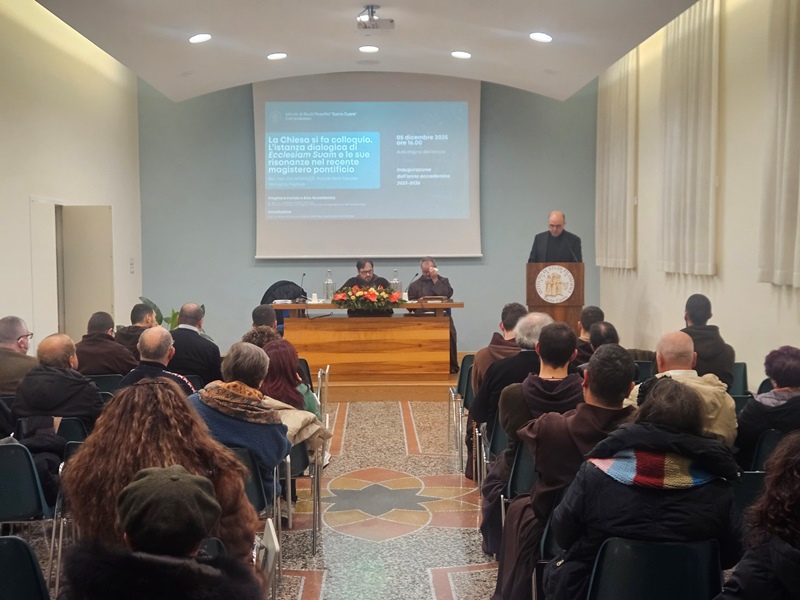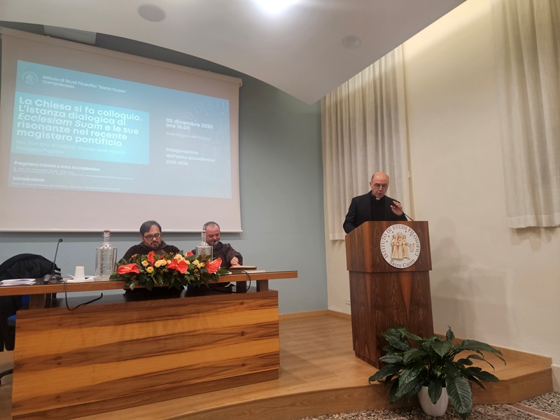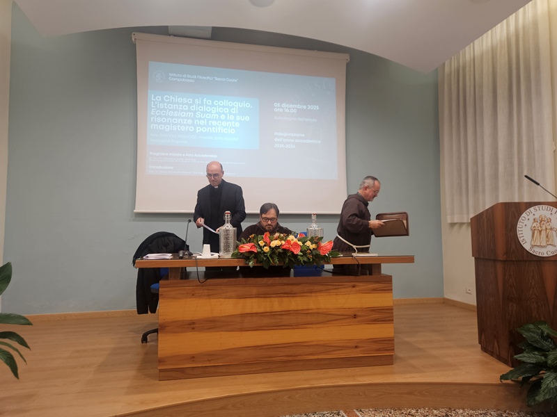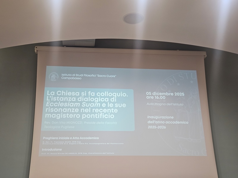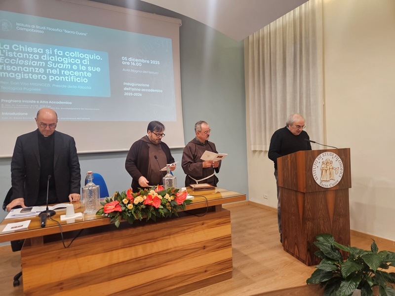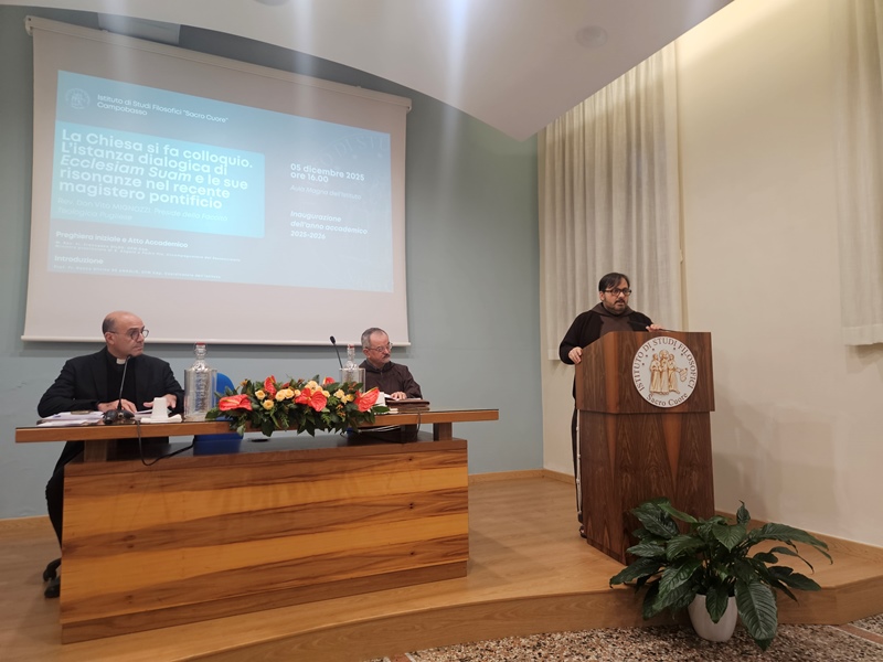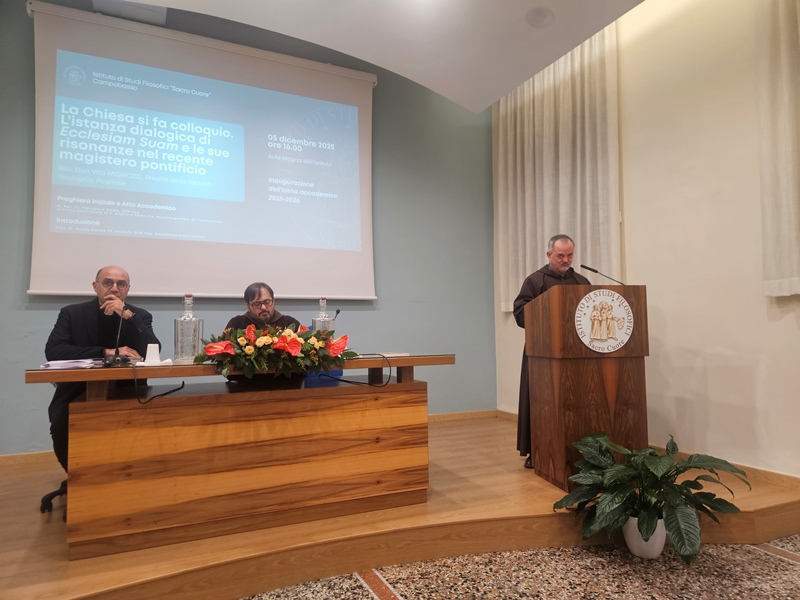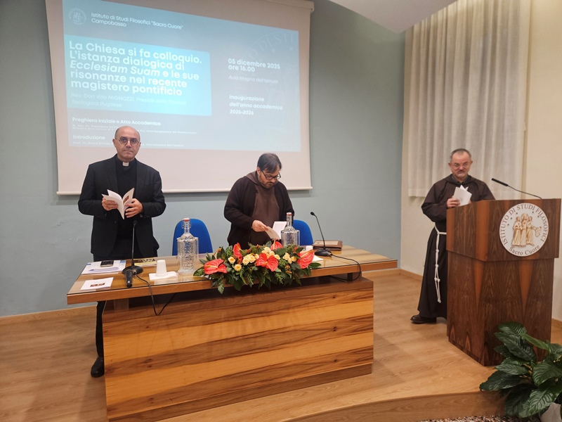 Nell’Aula Magna del nostro convento di Campobasso, alle ore 16:00, il giorno 5 dicembre, si è svolta la cerimonia di inaugurazione dell’Anno accademico 2025-26 dell’Istituto di Studi Filosofici “Sacro Cuore” del Postnoviziato. Il programma della serata, alla quale hanno partecipato docenti, studenti e fedeli, dopo la preghiera iniziale, ha seguito quest’ordine di interventi: i saluti del Ministro provinciale, nonché Moderatore dell’Istituto, e l’Atto accademico con il quale fr. Francesco Dileo ha dichiarato, ufficialmente, l’apertura dell’Anno accademico 2025-26; i saluti di Mons. Claudio Palumbo, vescovo di Termoli, presente alla cerimonia in qualità di docente dell’Istituto; l’introduzione del coordinatore dell’Istituto, rev. prof. fr. Rocco De Angelis; infine, la Prolusione inaugurale del Chiar.mo prof. don Vito Mignozzi, preside della Facoltà Teologica Pugliese, dal titolo “La Chiesa si fa colloquio. L’istanza religiosa di Ecclesiam Suam e le sue risonanze nel recente magistero pontificio”.